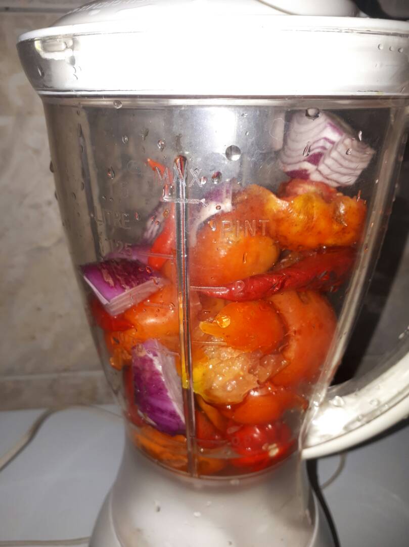 Wash your tomatoes, onions, pepper, and blend. Pour some palm oil in the pot and add the blended tomatoes. Add the meat stock and onions to the egusi and mix well. Add the egusi to the tomato and stir, then add the shaki to the mixture.